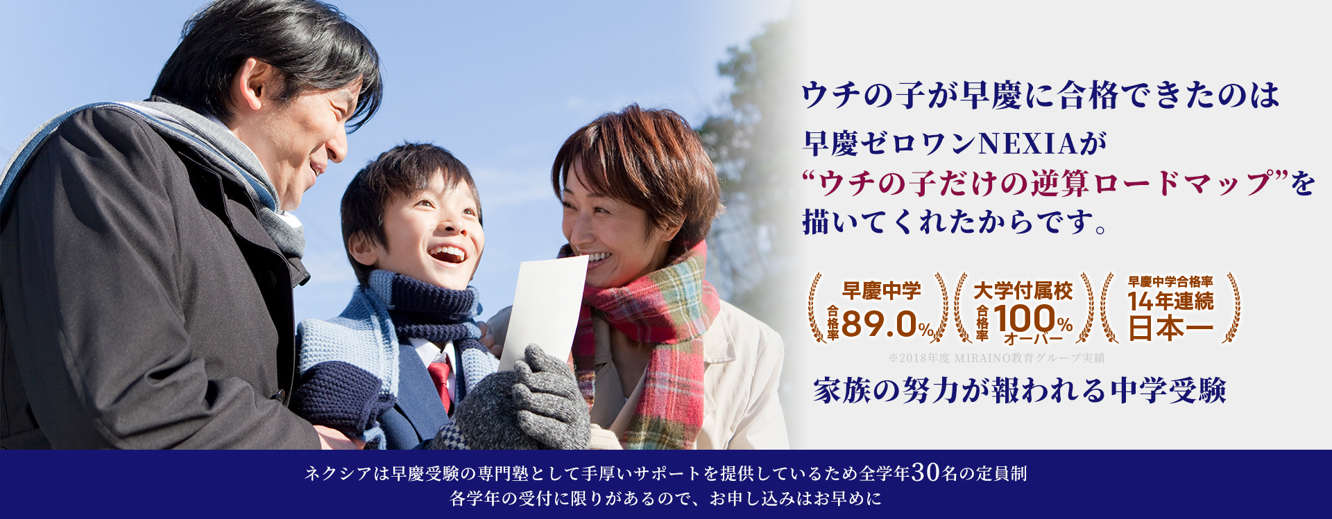 早慶をはじめとする大学付属校に専門特化することにより、志望校合格に必要な入試分析から最も効果的な指導が可能となり、圧倒的な合格率の高さとなっています。